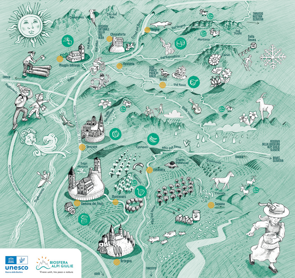 Vizualija: zemljevid Biosfernega območja Julijske Alpe, Italija, biosferaalpigiulie.it